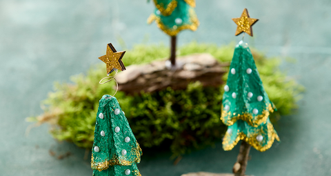 1. Klip æggebakken: Klip fire kegleformede stykker ud – to til hvert træ.